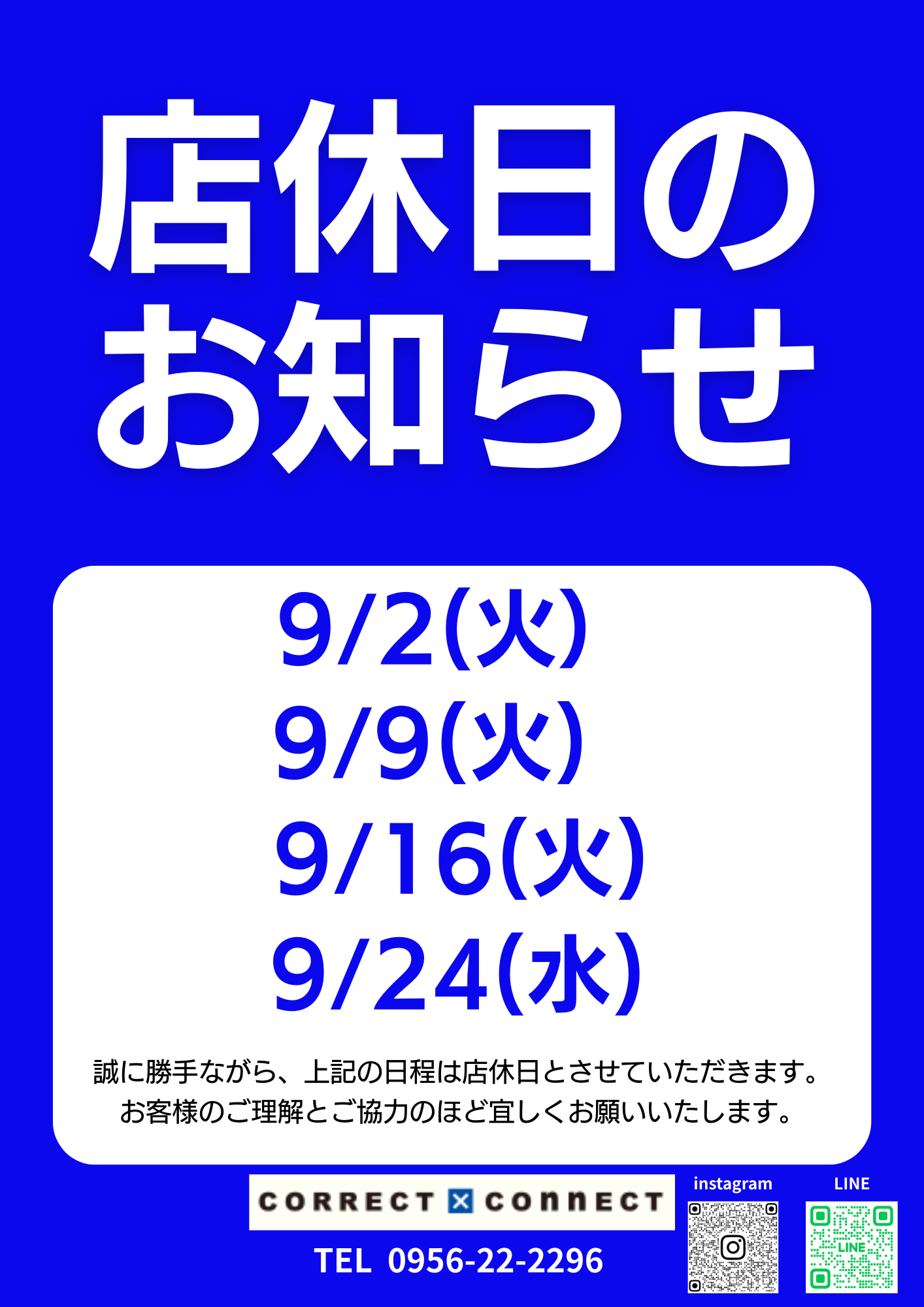 9月の店休日by CORRECT x COnnECT2025年9月1日2025年9月11日 店休日のお知らせです。 いつもご来店頂きありがとうございます。 今月から毎週火曜日(祝日によっては変更もございます)を店休日とさせていただきます。 お客様にはご不便、ご迷惑をおかけいたしますが何卒ご理解の程宜しくお願い申しあげます。